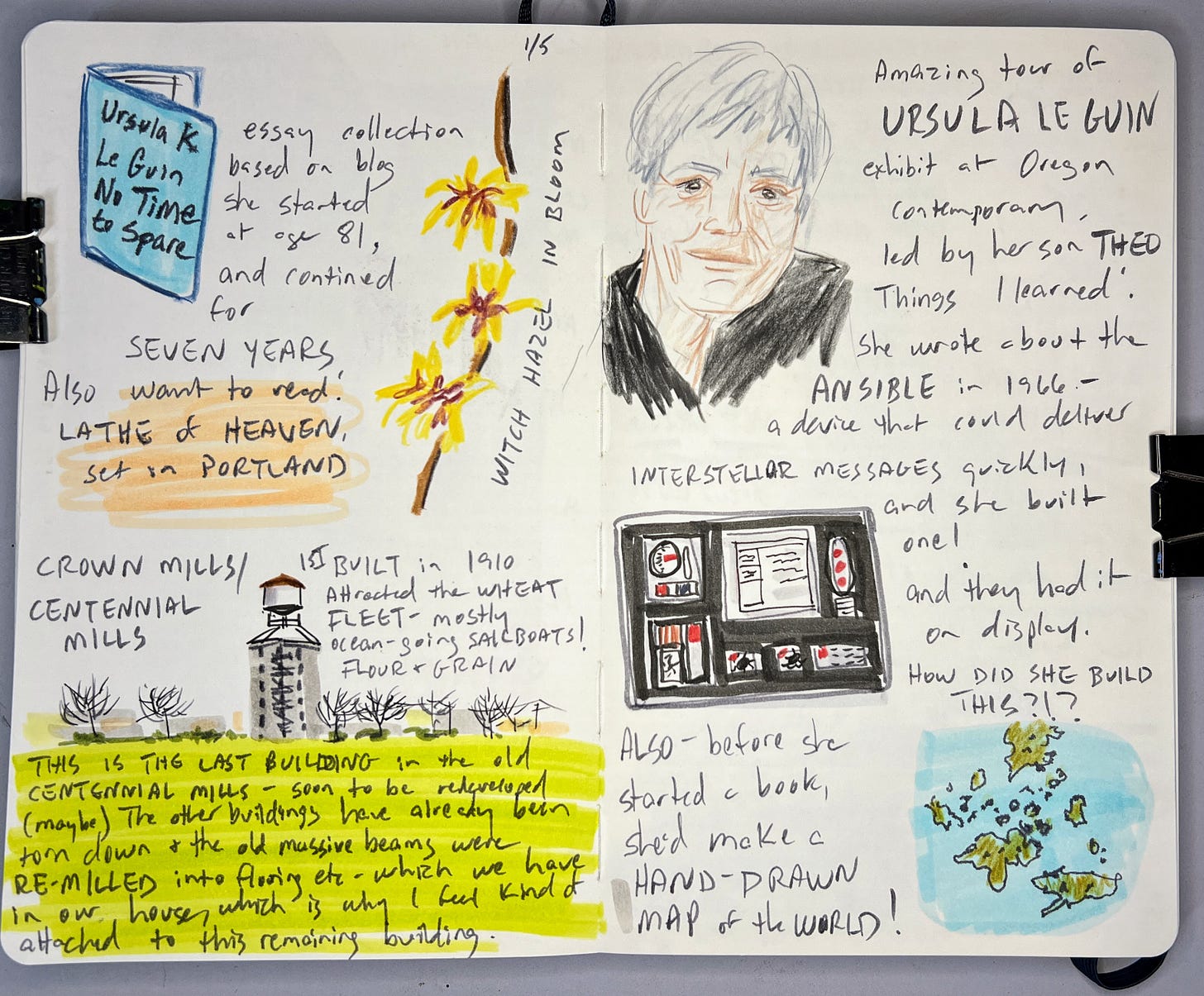 As evidence, I submit these two pages. It includes many interesting things, including a couple of books I’d like to read, a building that I think about every time I walk by it, the first day a particular witch hazel in my neighborhood bloomed (a recurring topic of interest to me), and some stuff about this Ursula Le Guin exhibit that I might write more about at some point. Also, I’m experimenting with a different way of drawing faces, so this is one of those experiments.
