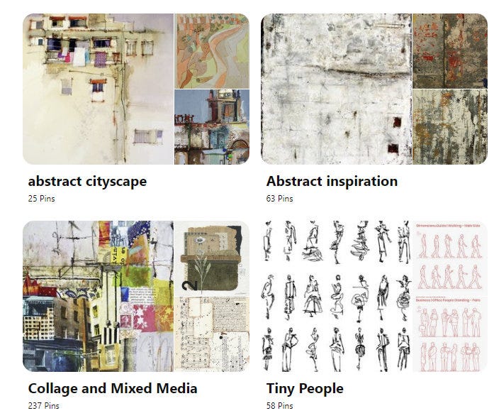 I didn't know that Pinterest rolled out a vastly improved search function a couple years ago, and now you can very quickly build amazing visual boards of anything that interests you. I'm always investigating some very particular style of art, and now I realize that if I start a board on that subject, Pinterest can find me pictures that are astonishingly close to what I'm interested in. If you've been away from Pinterest for a while, maybe now's a time to go take another look...whether you're doing art, books, travel (dreaming), food, gardening...I've found so many more new people and new ideas than I ever did when I used the platform before. You can find me here.