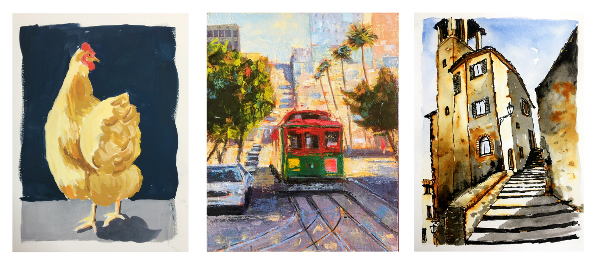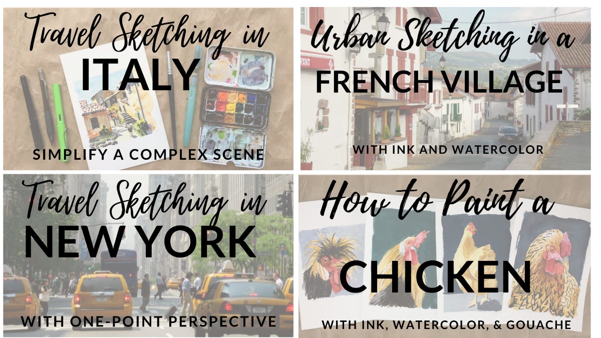 Since we last spoke, I've been making travel sketching classes on Skillshare...and a class on how to paint a chicken. Chicken portraiture is a speciality of mine, I don't know if you knew that.