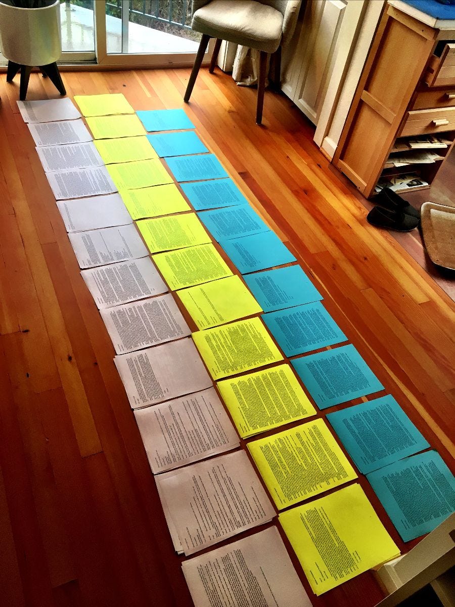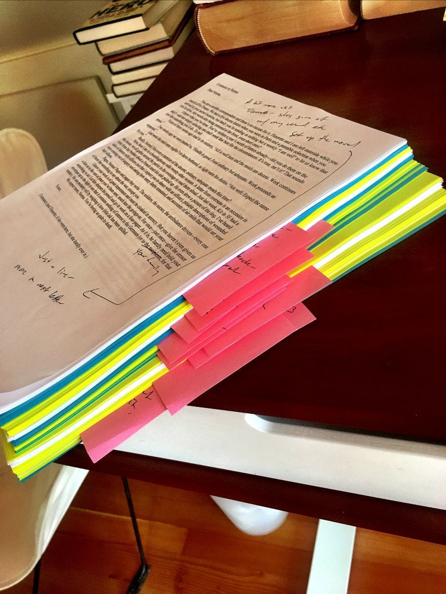 And yes, I planned out the stories first (just writing them out, paragraph by paragraph, like summaries of the events), and then I wrote all of Norma's letters in one go, then all of Constance's, then all of Fleurette's...and then I spread them all out on the floor (pictured above, with each sister a different color), moved them around, stuck post-its on them, and tried to figure out the chronology of the whole thing so that the events all came together in a way that was plausible and that wrapped up around Armistice Day!