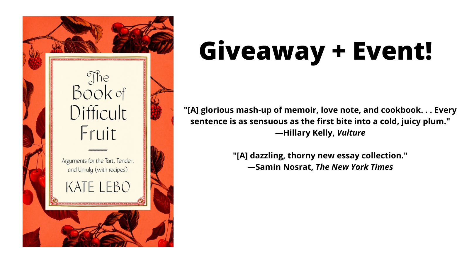 I'm doing a different kind of giveaway this month. I have five copies of Kate Lebo's new book, The Book of Difficult Fruit, to give away, AND I'm doing an event with her on April 22 and I'd love it if you could join us.