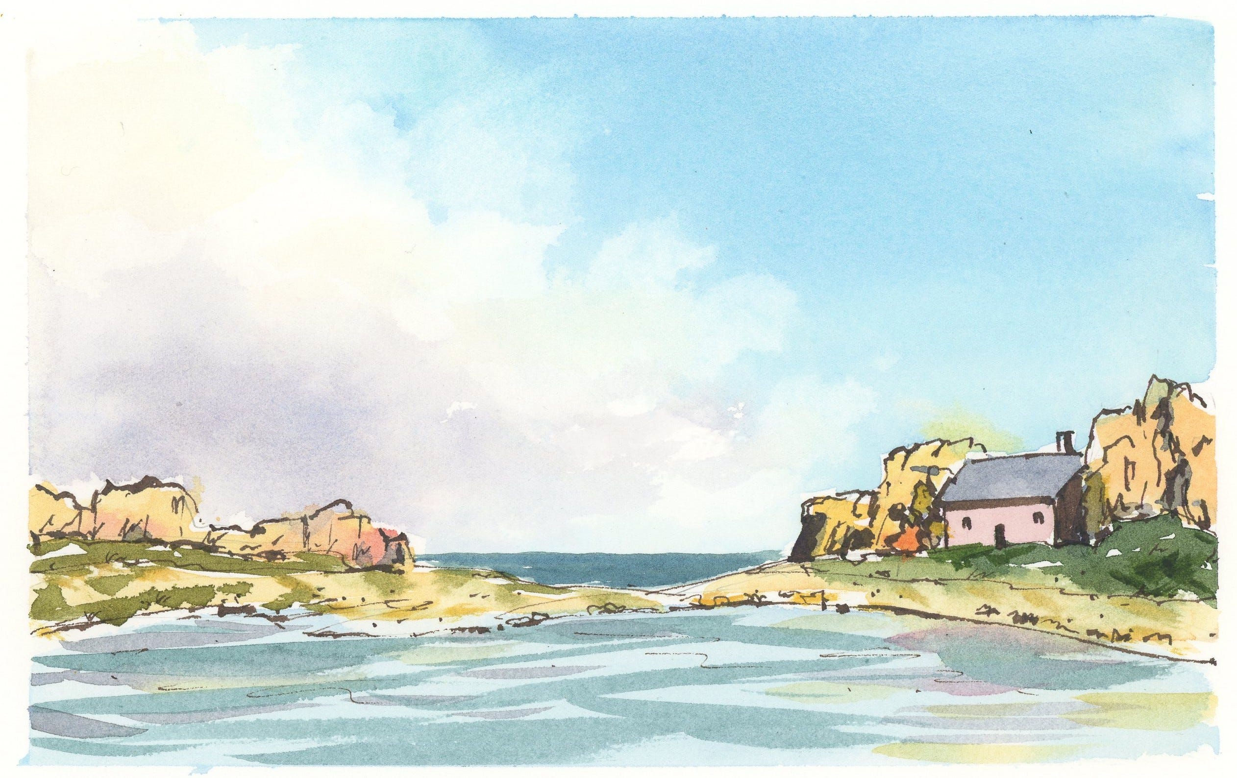 I also left out the seaweed or whatever purplish thing is floating in the water in the foreground. This is a great example of something that looks cool in the photo but would be really hard to “read” in a painting.