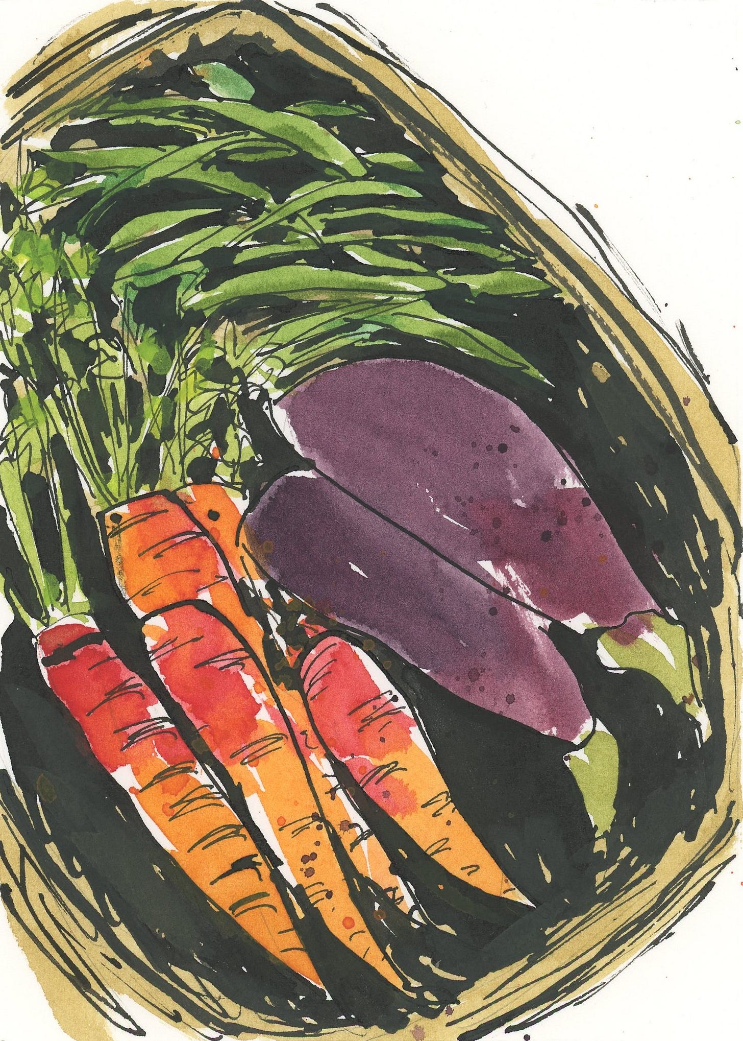 I chose to do these dark, inky shadows rather than draw every detail of the inside of the basket. We know these ar…