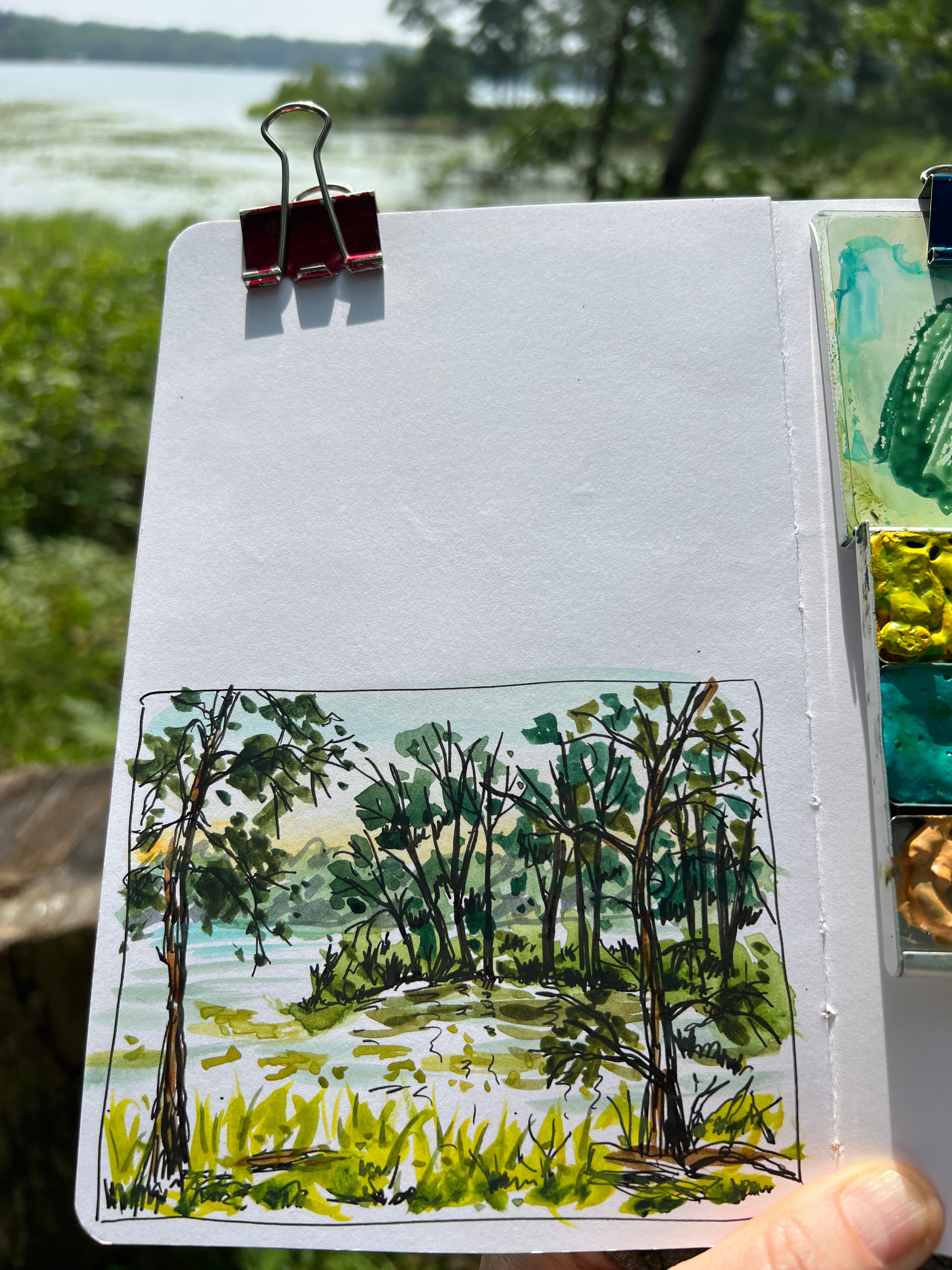 Then I used watercolor to define the edges of the trees and the landscape.