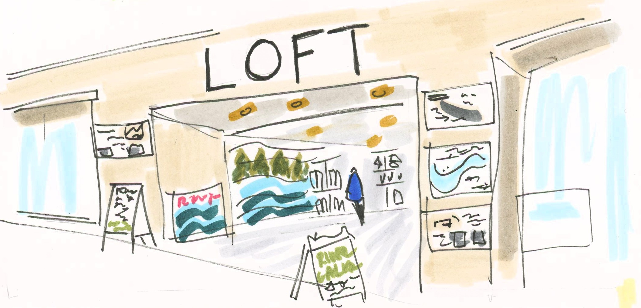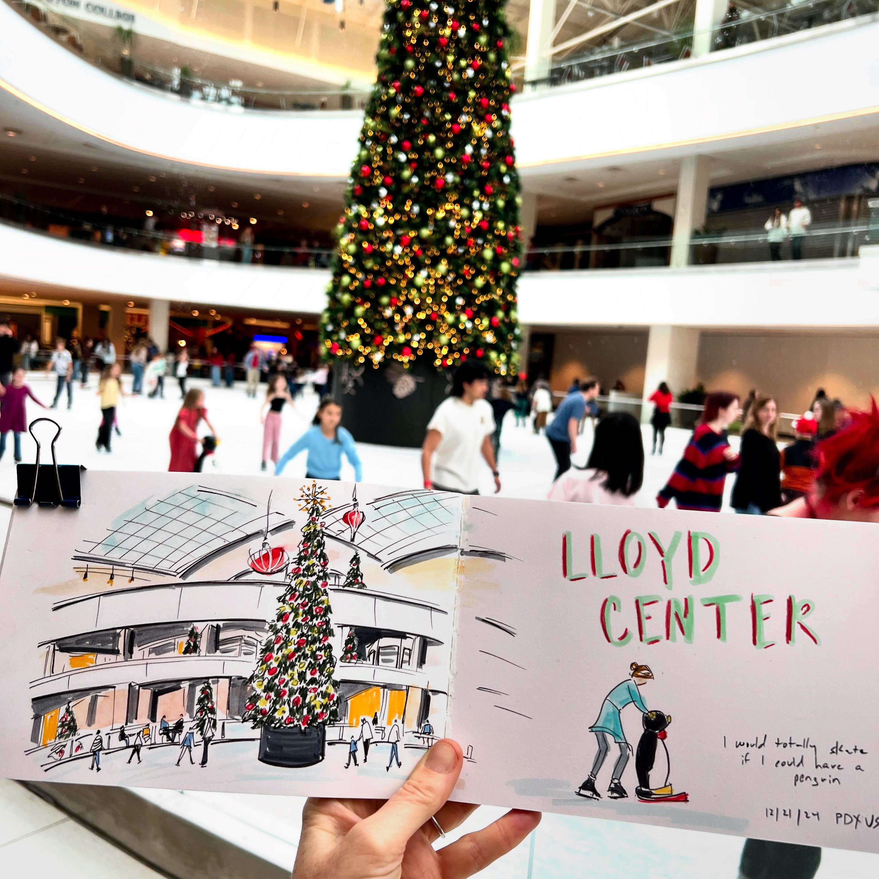 Just before the holidays, our urban sketchers group went to the Lloyd Center to draw the ice skaters. The Lloyd Center is Portland’s dying mall; you probably have one like it where you live. In the sixties, it was a breezy open-air mall with an ice skating rink in the middle. In the seventies and eighties it was a sprawling indoor megamall with anchor stores like Nordstrom and JC Penny, interspersed with places like WaldenBooks and Express and Orange Julius.