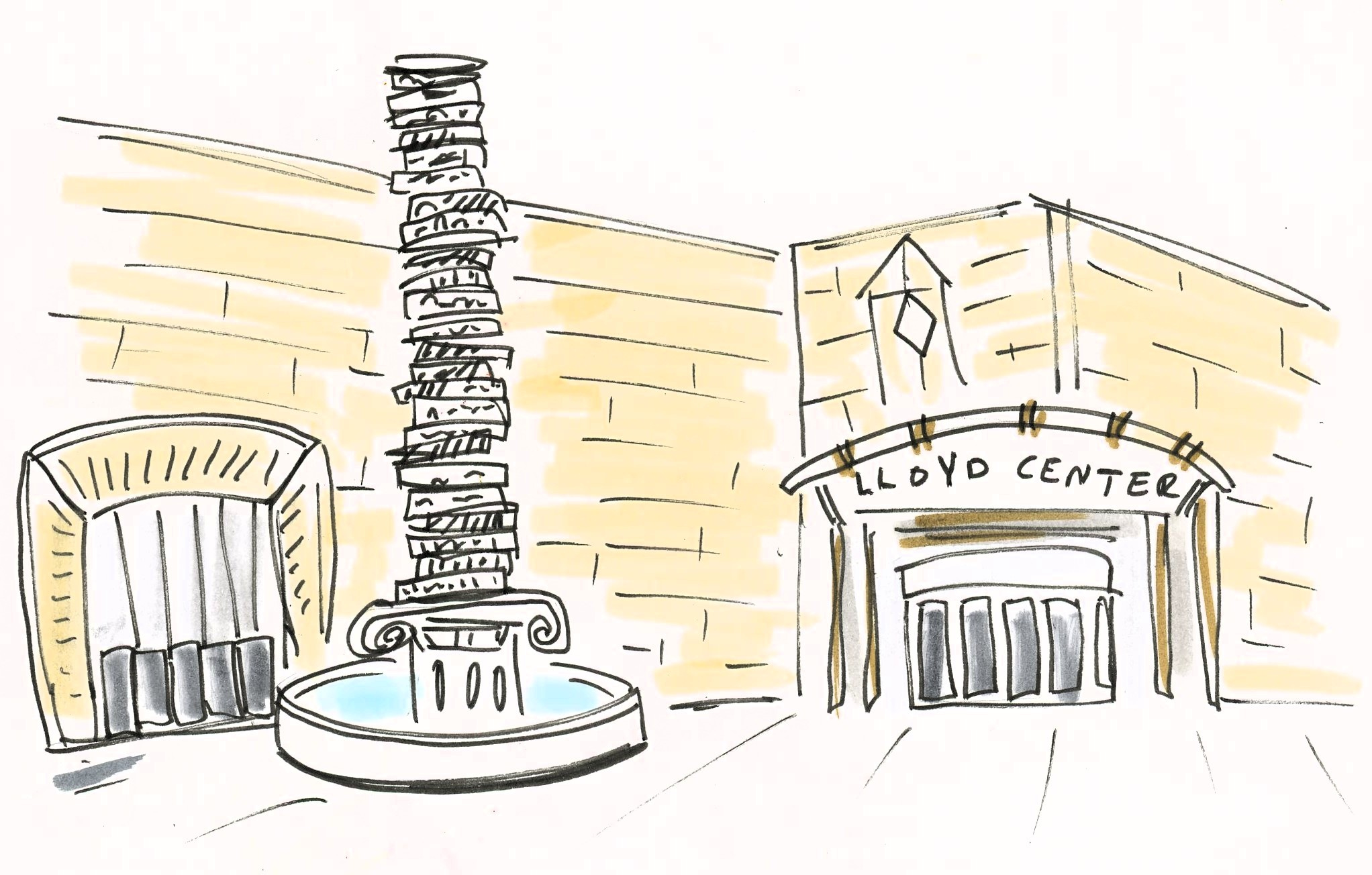 The sculpture was covered in grime and the fountain it sat in had long ago stopped working. Many in our merry band of artists didn’t even bother going inside the mall. Nothing was happening in there. We drew the crumbling monument to capitalism and called it a day.