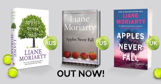 Now I must rant for a minute about this cover. Liane Moriarty is a global bestselling author. Her publisher undoubtedly spends a fortune launching her books. They can afford to hire not one, but several of the world’s best cover designers to come up with brilliant, eye-catching cover ideas. Instead, she got this. For a novel titled Apples Never Fall (not a great title, but there it is), about four kids in a tennis family, she got…four apples improbably perched atop a tennis net.