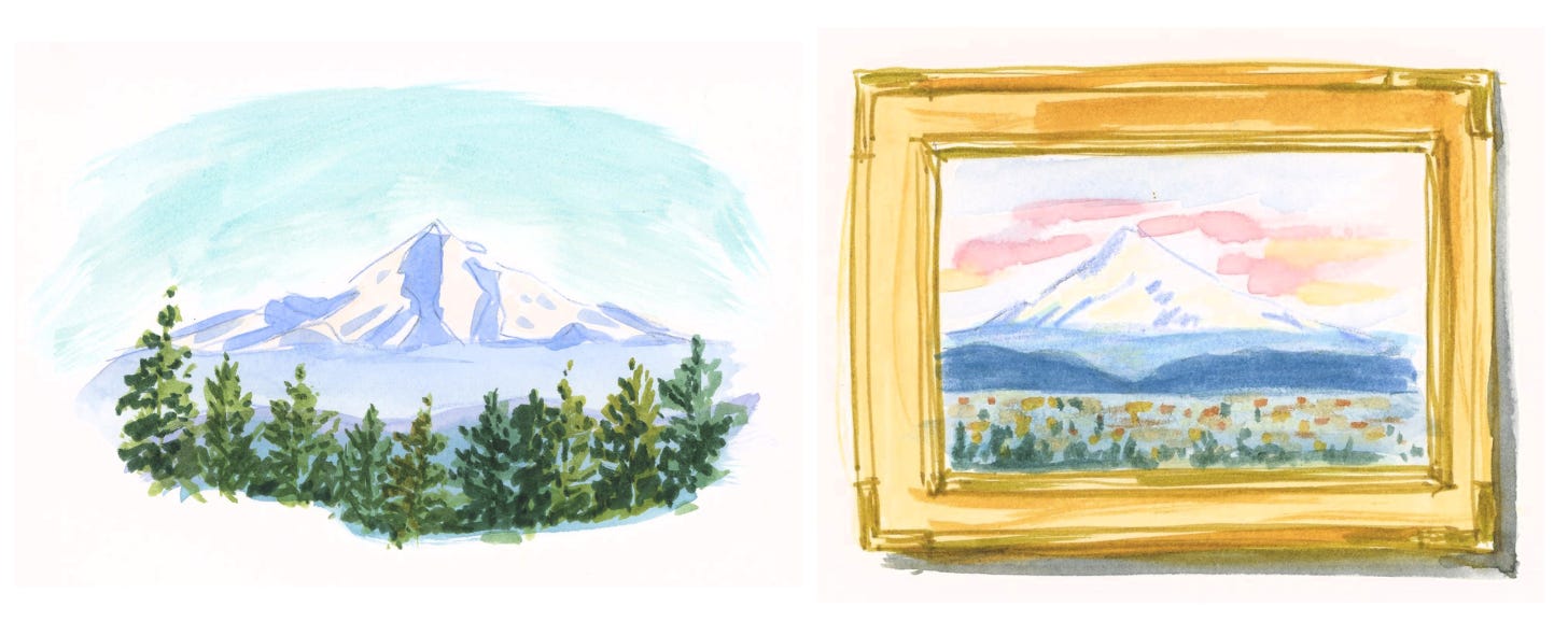 All three offer lovely views of Hood, with Portland in the foreground. Which one is the best candidate? I tried to figure it out by looking at the configuration of low-lying hills in the foreground and lining those up with the peak of Hood. You can see my attempts at this analysis in the sketchbook spread above.