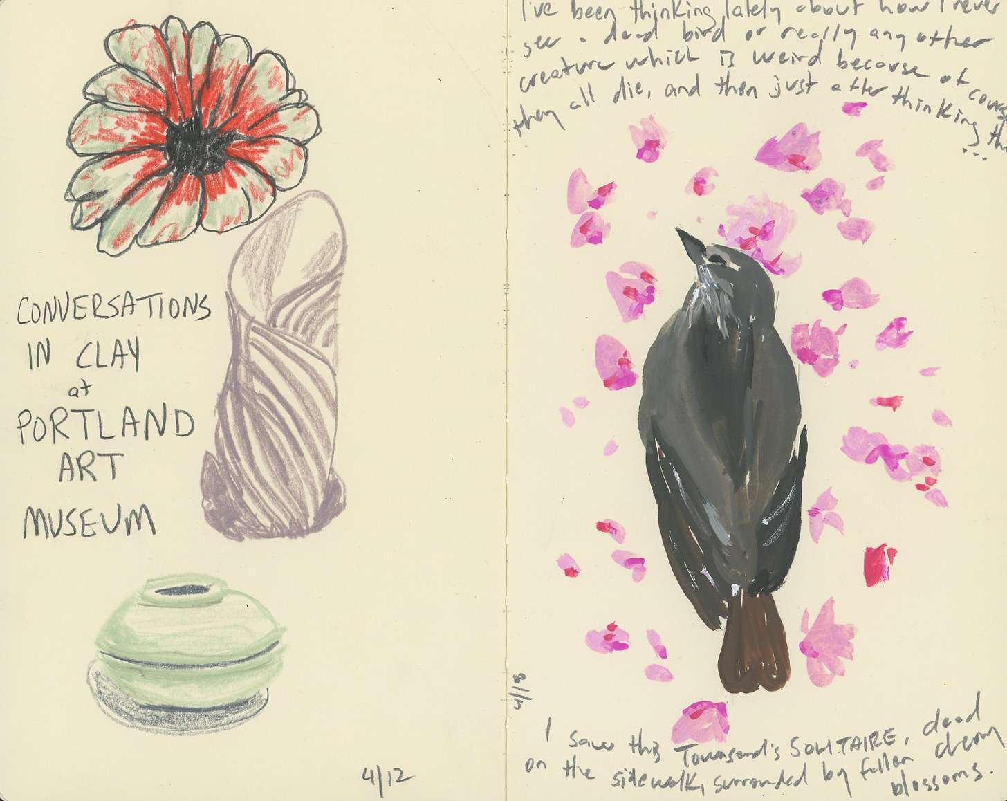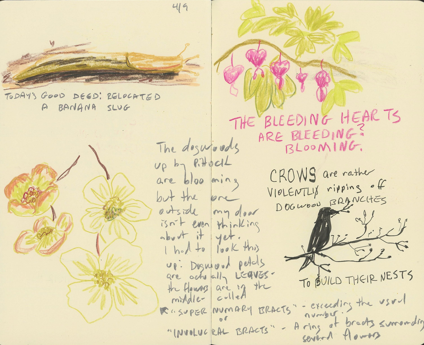 I relocated a banana slug off the trail in Forest Park, which I felt was necessary because people run on this trail and I have definitely seen squished banana slugs before, and once you’ve seen that, you can never unsee it. I also noticed that the dogwoods and bleeding hearts were blooming for the first time, and I realized that I always notice when something is blooming for the first time and thought I should write that down.