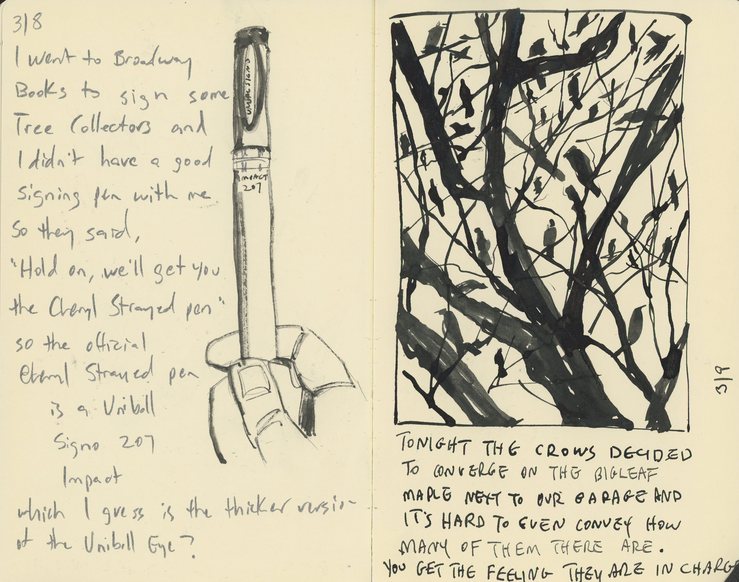 Here I drew a picture of all the crows converging on a maple tree near my front door (and I do mean ALL the crows, there are thousands of them, and when they pick your house to land on, it is WILD), and then I also drew a picture of myself holding the Cheryl Strayed pen at Broadways Books. (I did not mean to make a Wild/Cheryl Strayed pun there, it just happened.)
