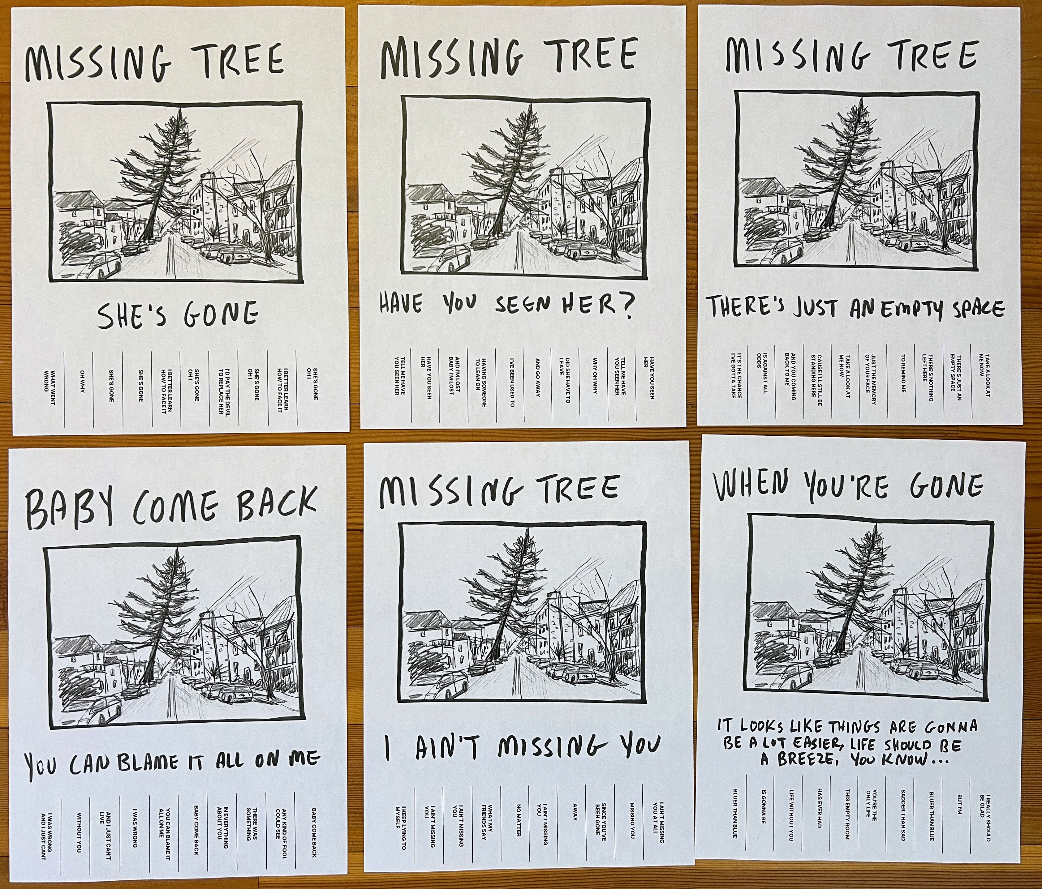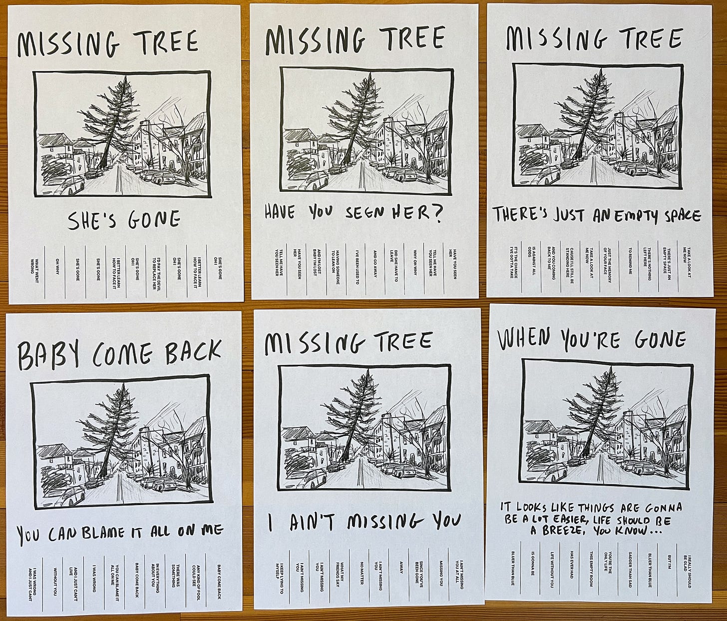 I wanted to do something else to mark its absence. Every sad song of lost love was on rotation in my mind, so I made some missing tree flyers, put the lyrics on the little tear-off tags where the phone numbers go, and posted them on telephone poles up and down the street.