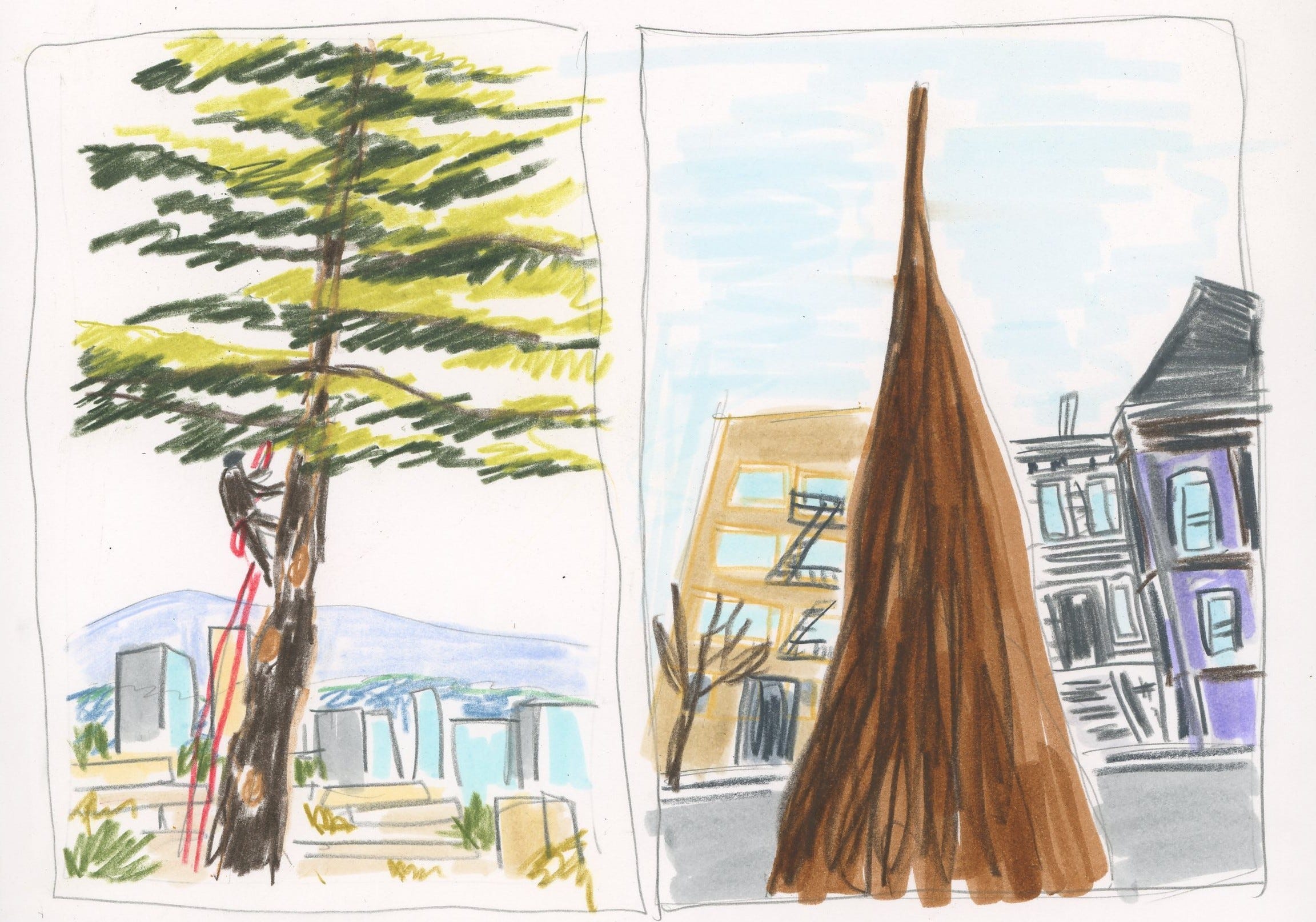 On the morning of the third day, the man whose house sat behind the tree came outside when the crew arrived, carefully unpinned what remained of my drawings, and took them inside. Then a man harnessed himself to the tree, climbed to the top, and grabbed a rope that was dangling from a crane and attached that to the top of the tree. Then he lowered himself down ten or twenty feet and took a chainsaw to the trunk. The crane lifted that top section off and deposited it gingerly in the back of a truck. In this fashion the man worked his way down the tree, until noon, when it was gone. The crew maneuvered another machine over to the stump and ground it away until there was nothing but a pile of sawdust.