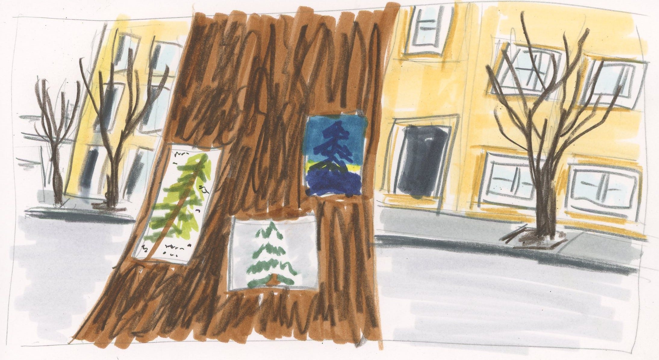 I couldn’t bear to see it like that. It was undignified. In my grief I went through all of my sketchbooks, looking for paintings of the tree. I chose my favorites, made some color copies, and walked over with a box of thumbtacks.