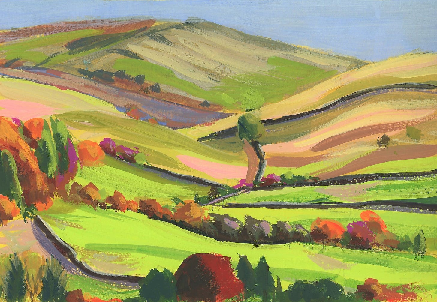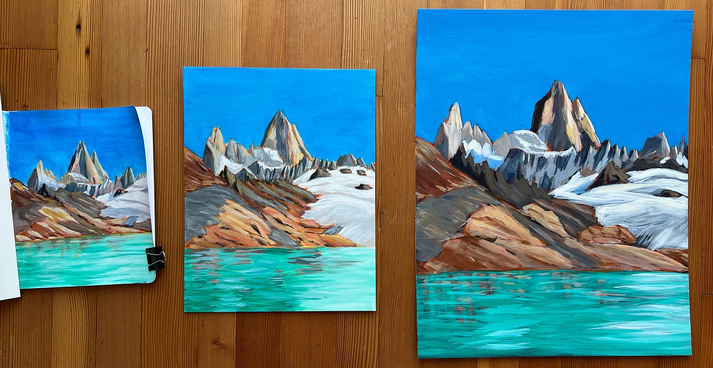 Left to right: acryla gouache and acrylic ink in an 8x10 sketchbook, then acryla gouache and acrylic ink on an 11x16 illustration board, and finally, acrylic paint with a little acrylic ink on a 16x20 illustration board.