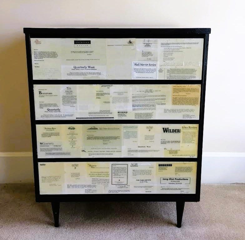My rejection letter dresser still sits in my office today, where, ironically, it mostly serves as a platform for various electronic devices that need to be plugged in and kept nearby. The drawers are filled with extra sheets and towels, not for any writerly reason but because we have nowhere else to put those. Every day I look at the rejections from long-dead magazines, and some, like the New Yorker, that are still around and standing by to reject me yet again, should I ever decide to collect another one of their slips.