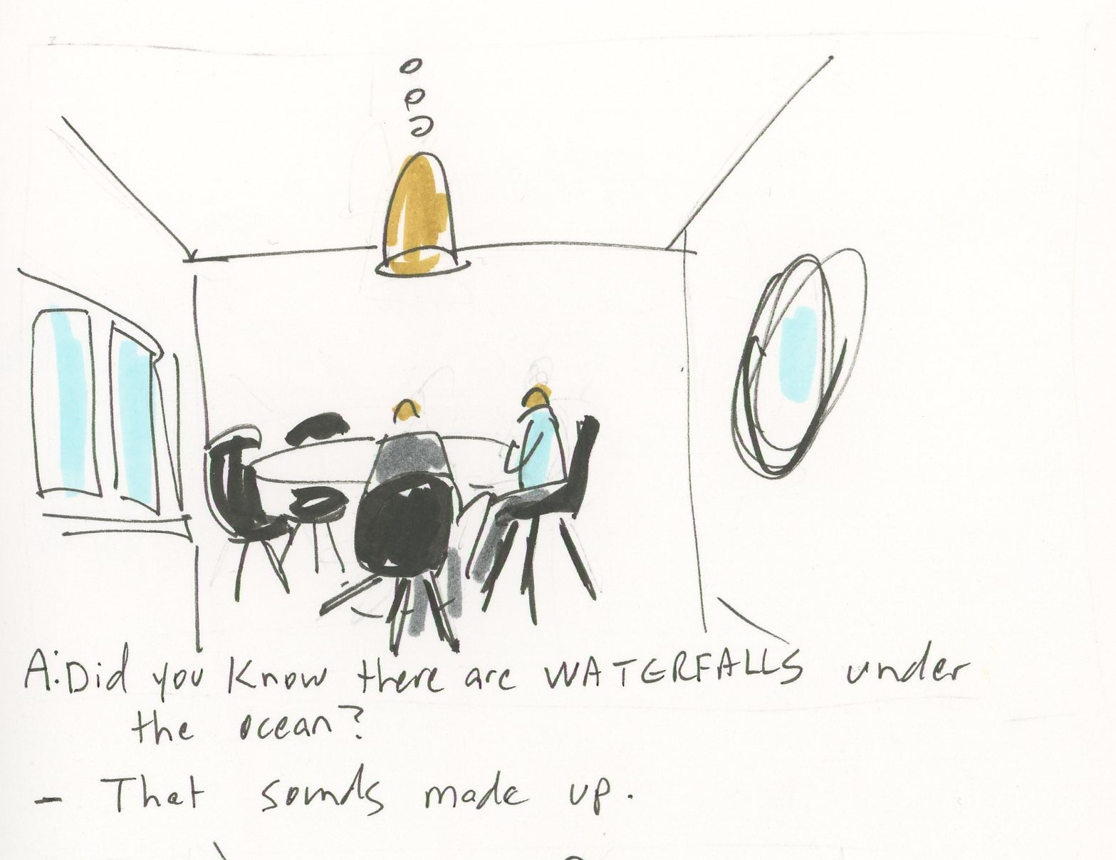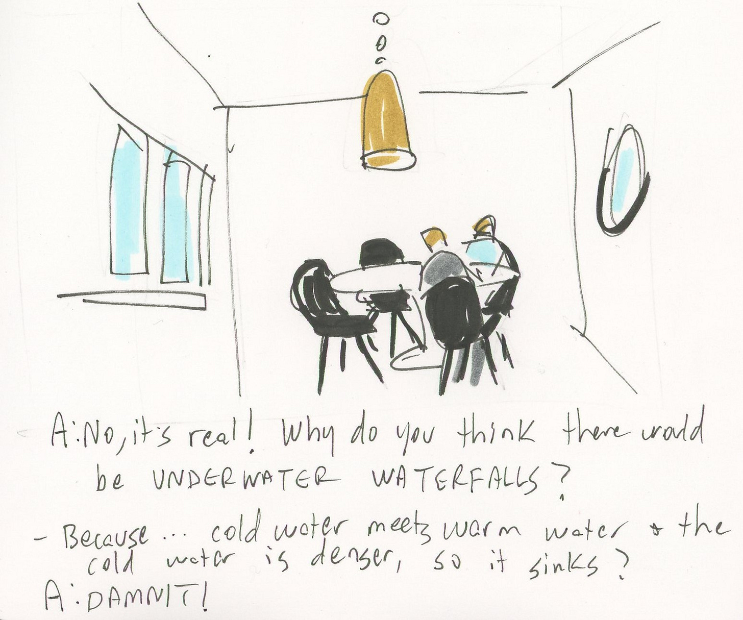 I made a little cartoon for you about my life. Here I am, telling my husband about underwater waterfalls. Scott Brown is a rare book dealer who actually paid attention in school and knows a little bit about a lot of things. It’s kind of scary, the things he either knows or can figure out.