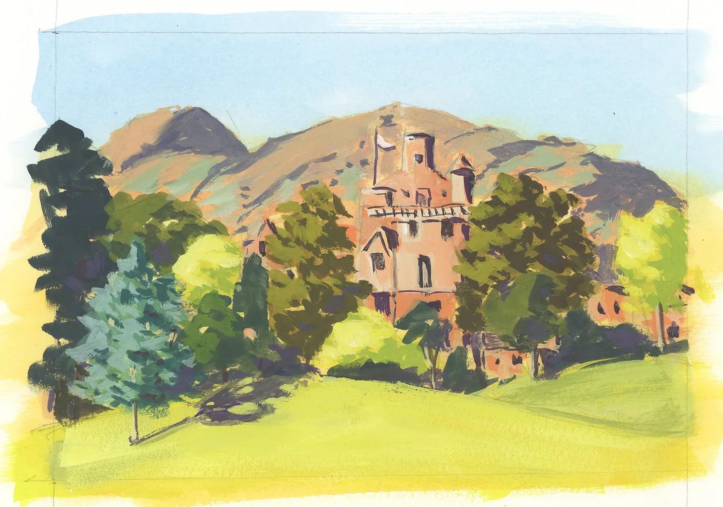 For my subscribers I have a thing called Patron of the Arts where I’ll paint a place from a photo you send me and mail you the painting. I did this landscape recently for one of those art patrons, and I filmed the process so we could go through it step-by-step. This, and just about anything else you can do in a sketchbook, is what we get up to every week, usually in the form of short art tutorial-type videos.