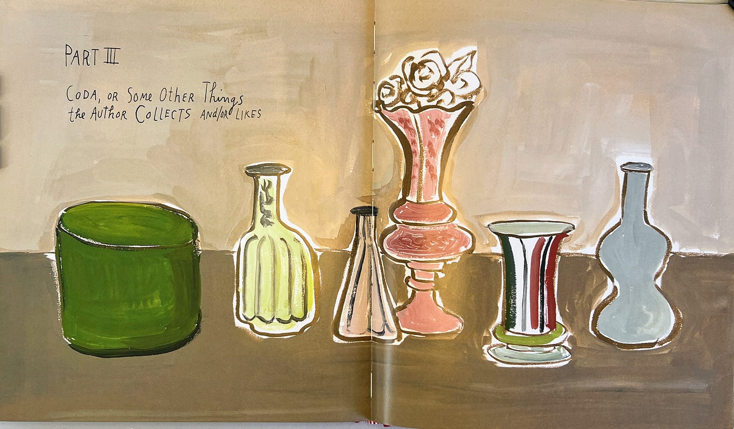 Okay so then I also happened to pick up one of her earlier books, My Favorite Things, which came about in part because she was once invited to go through the collection of the Cooper-Hewitt, Smithsonian Design Museum and pick out her favorite things and make art about them.