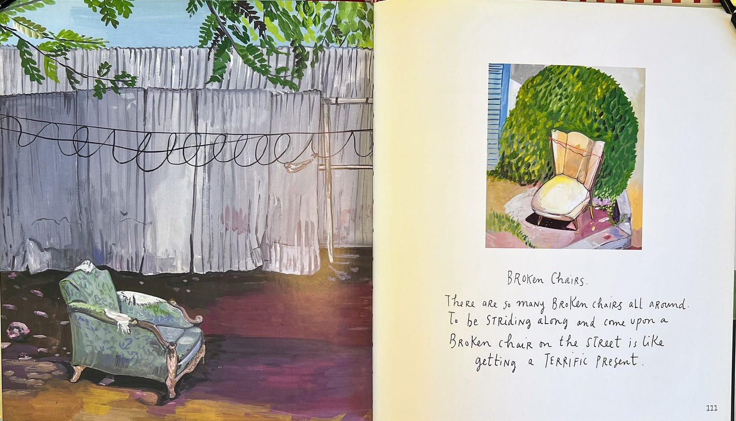 I happen to know, because I listen to a lot of Maira Kalman interviews, that she loves the broken chairs that people put out on the sidewalk and has been known to take them home. Even if she doesn’t take them home, she paints them.