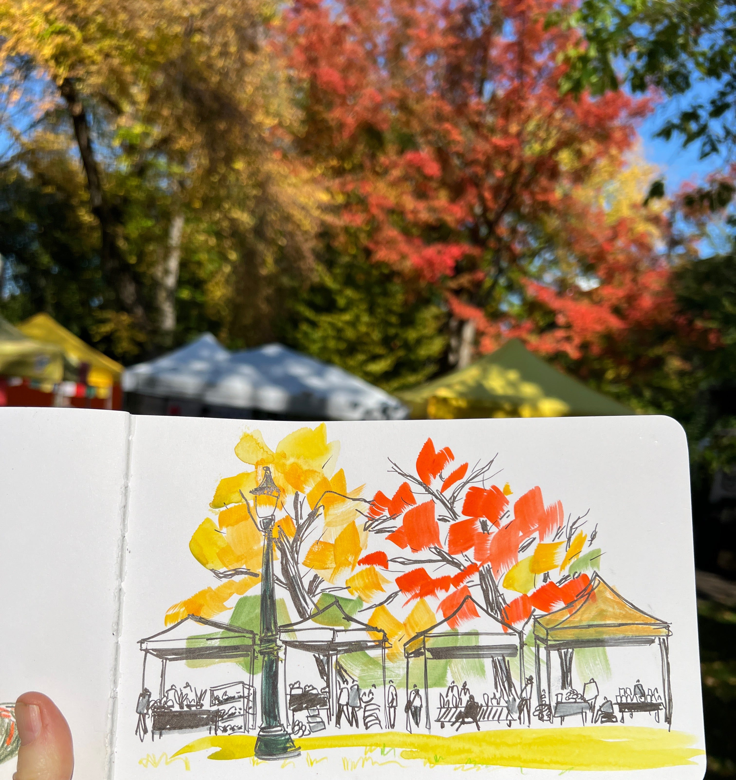 We’re exploring the idea of being the artist-in-residence of a season right now, and that season (for most of us) is FALL! So I took my art supplies to the farmers market and drew a bunch of pumpkins and squash, and also this quick scene of all the tents under some gloriously autumnal trees. And I filmed it for you.