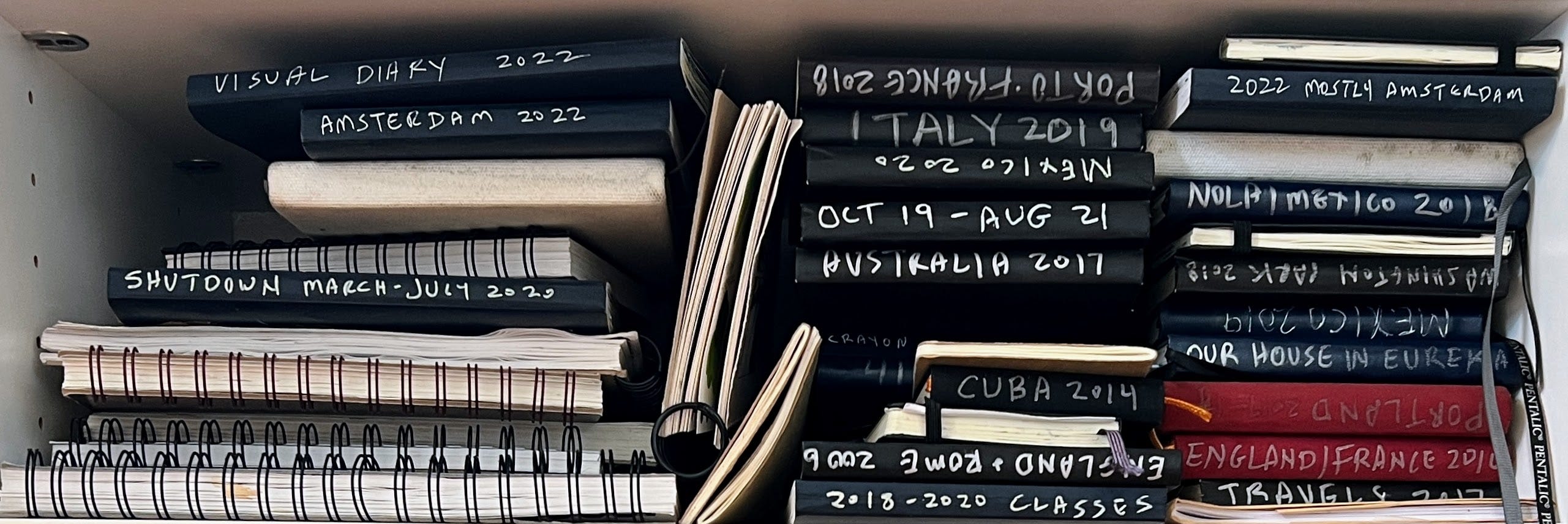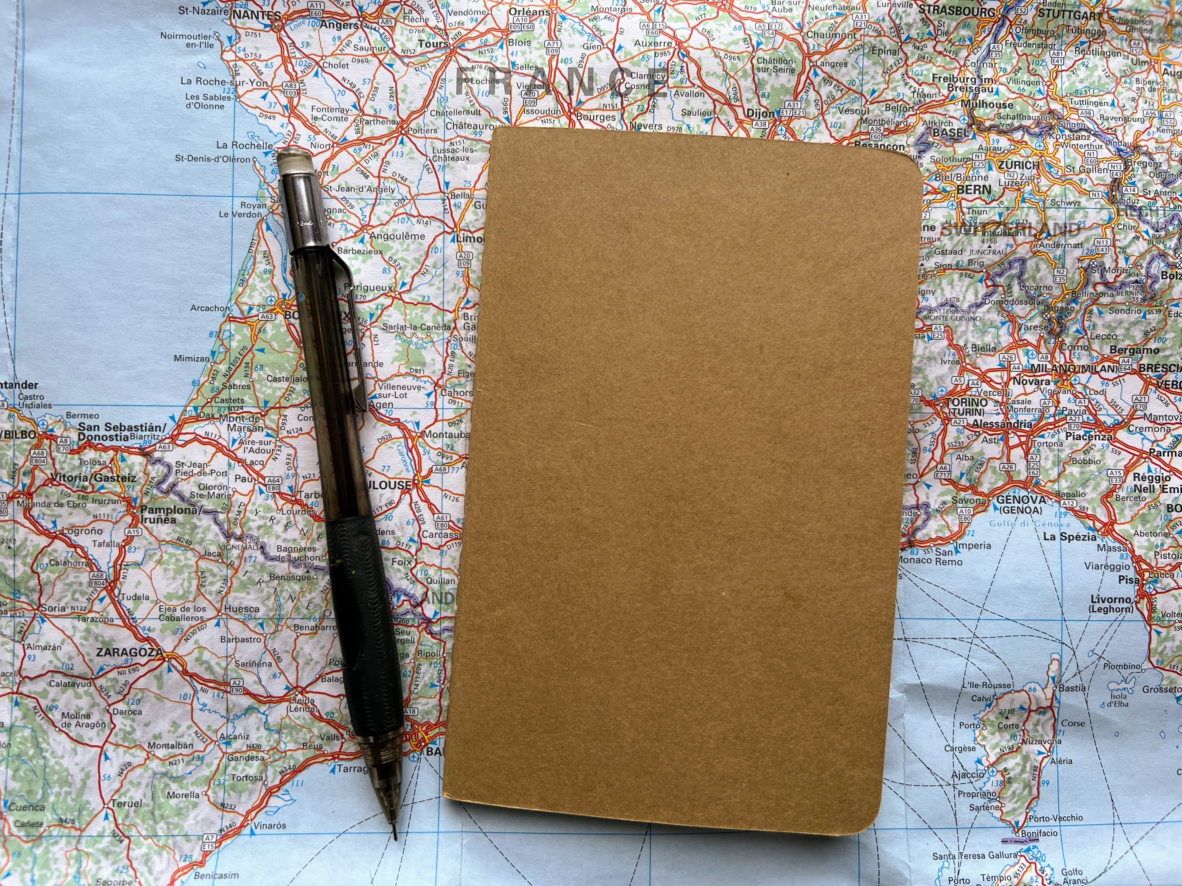 I carry one of these everywhere, not just when I’m traveling. It’s a Moleskine Cahier Journal (they’re only 3 for $10) and a Pentel Side Click mechanical pencil. My favorite leads are Rotring .7 2B (here’s a reel about that) but any lead will do. Of course, any pen or pencil or marker will do.