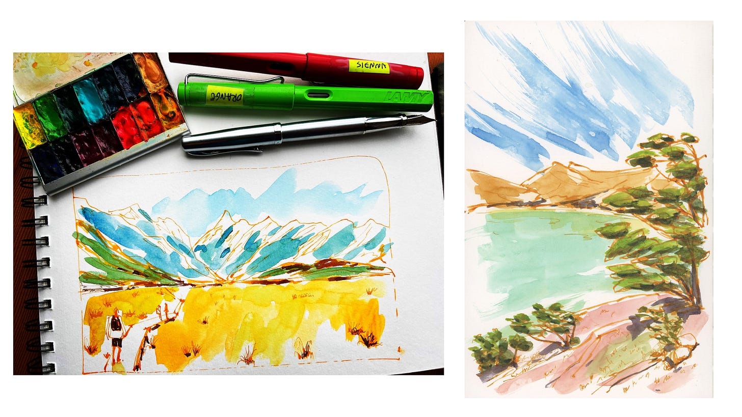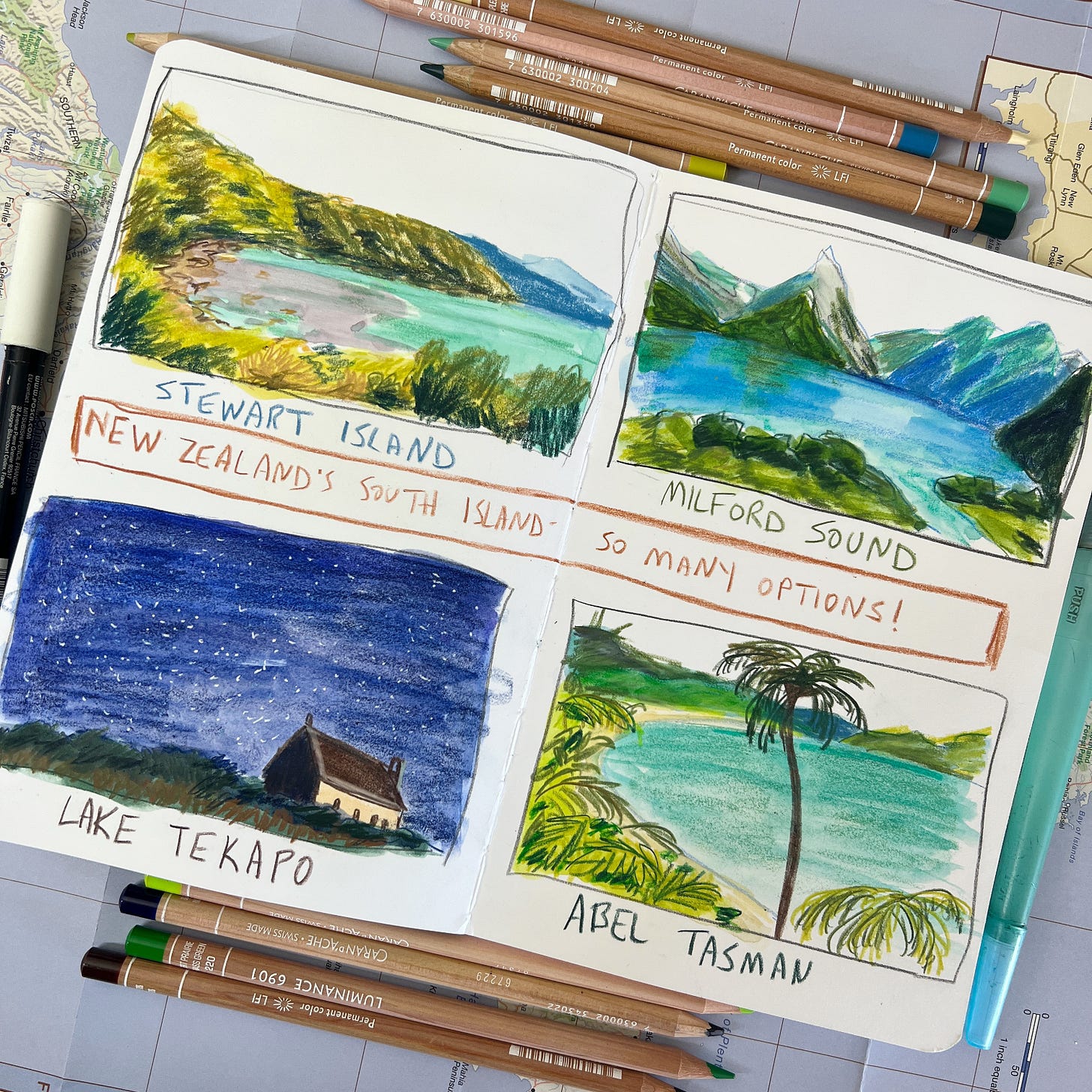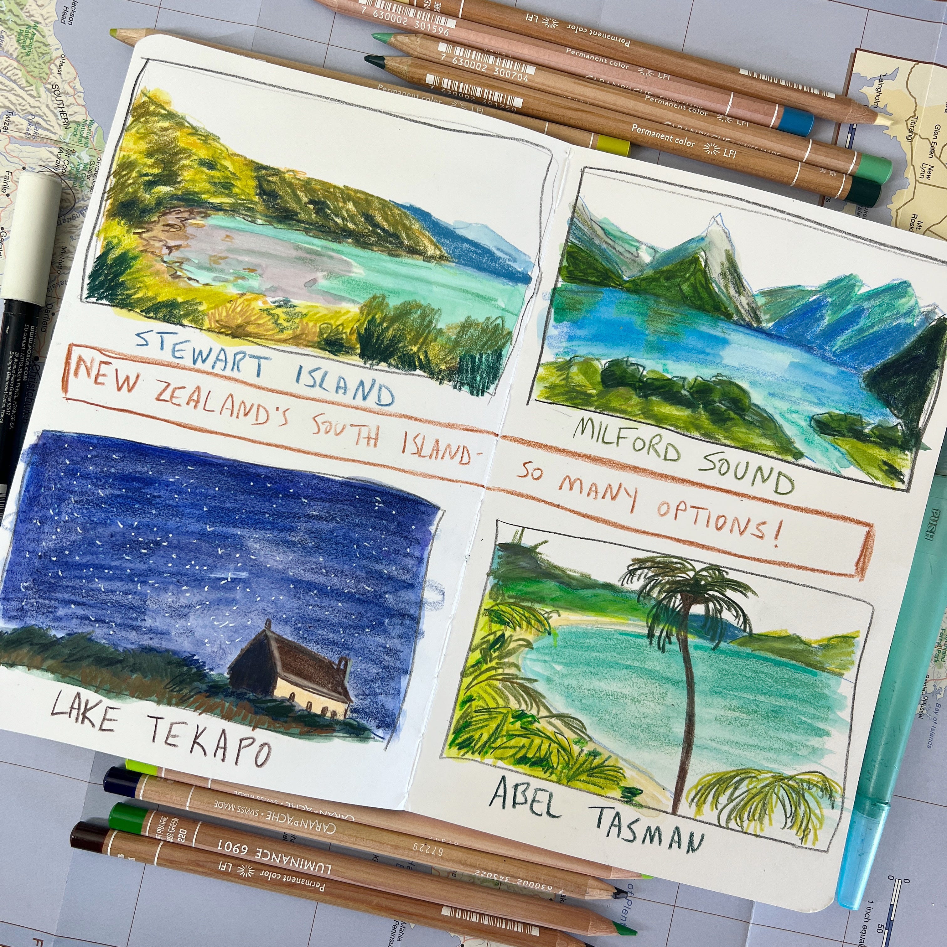 So here’s the thing about colored pencils and markers—you don’t need every color! Take a tiny watercolor kit so you can fill in any color gaps with paint. For instance, all your sky/water/ground colors can from paint: blues, yellows, greys, greens, etc. Then draw on top with your markers or pencils. Here’s a little combo platter of a sketchbook spread with watercolor plus colored pencil: