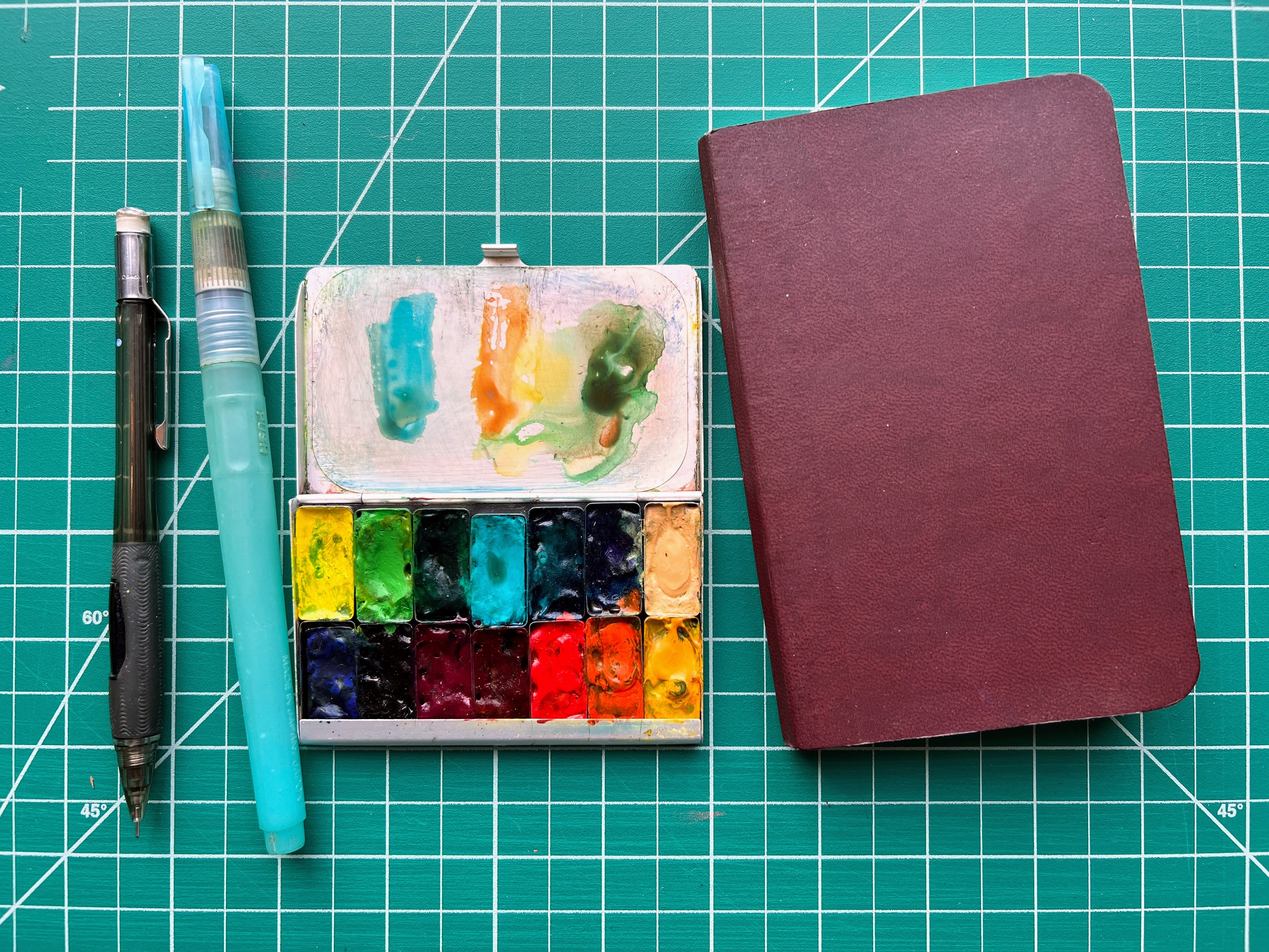 Here’s a slightly heftier version, requiring something more like a jacket or cargo pants pocket: A softcover Stillman & Birn 3.5 x 5.5 sketchbook, which comes in a variety of paper choices—I like Zeta for drawing & light watercolor, but get Beta if you want to do heavy watercolor. Add a tiny ArtToolKit palette, a water brush with water inside, and maybe a pencil or waterproof pen. Grab a paper napkin along the way somewhere to wipe your palette clean. Off you go!