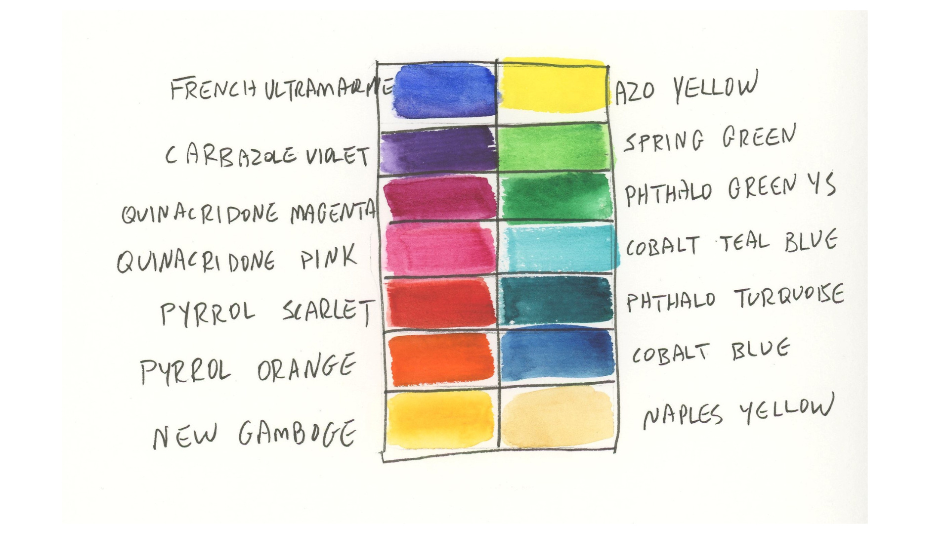 My colors are all Daniel Smith. Here’s my current palette, below. Here’s a video where I explain why I organize the colors this way. If you’d like to learn more about the Munsell or CMYK palette, I teach a class on that, and I also demonstrate this palette in my Amsterdam class. But if you’re wondering where the earthy neutral colors are—you can mix them all from this palette! I promise!